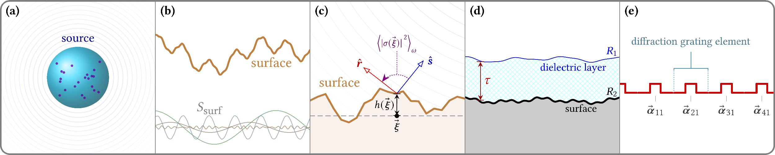 Examples of light-matter interaction that we discuss in this paper. (a) Sourcing of partially-coherent light: Charges and current in a light source give rise to electromagnetic radiation. The amount of charge together with its spatial correlation fully describe the emitted radiation and its coherence properties. (b) Scatter by a statistical surface: A surface (brown) is decomposed into its spatial frequencies (illustrated in gray). The power of each frequency is given by the power spectral density (PSD) function Ssurf, which plays an important role in describing the scattered radiation and is the spectral decomposition of the stationary correlation R. (c) Scatter by explicitly-defined microgeometry: A surface patch is described by the (explicit) height perturbations h(ξ), where ξ is a point on the surface plane (gray dashed line) and ⟨∣σ(ξ)∣2⟩ is the (ensemble-averaged) scattered intensity. (d) Layered structure: A dielectric layer over a substrate, where the surface of each is described statistically via the stationary autocorrelation functions R1 and R2, respectively. The surfaces are assumed to be statistically independent. (e) Diffraction grating: A two-dimensional grid of small and identical, but otherwise arbitrary, optical elements produces a diffraction grating. The elements are regularly spaced and the position of the center of each element is denoted αpq.