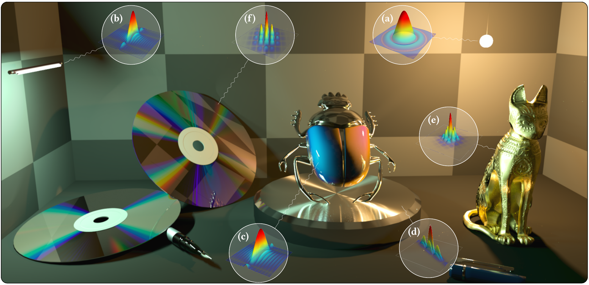 (bottom) Same scene rendered with classical radiometric light transport, where the golden scarab's wings are rendered using Belcour and Barla [2017].