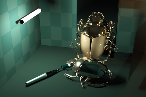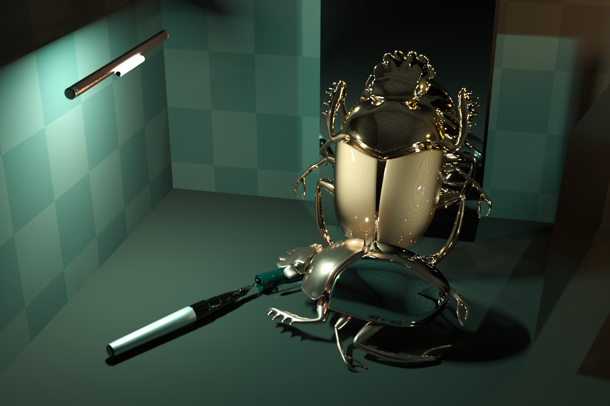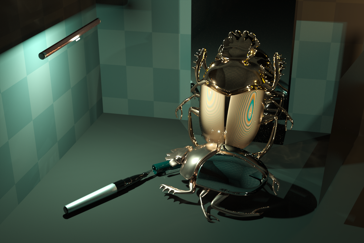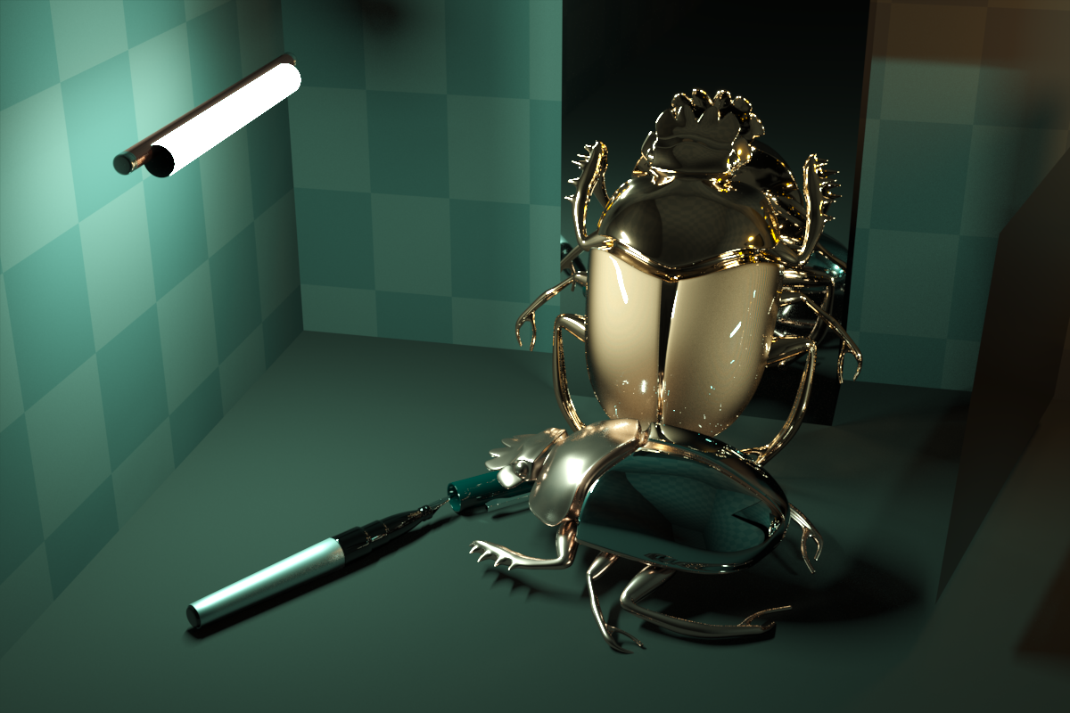 The required sample count also grows exponentially with path depth: light that is scattered and diffused by the rough surface of the body of the smaller copper scarab reaches the bottom parts of golden scarab wings.